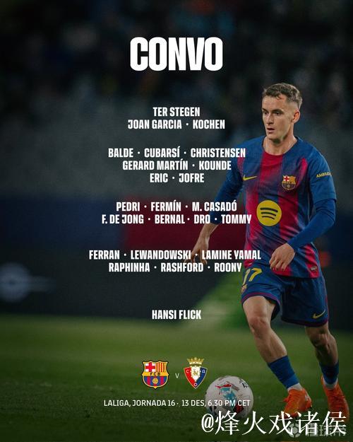 巴萨战奥萨苏纳大名单:莱万、亚马尔领衔,特狮在列,3C缺阵
